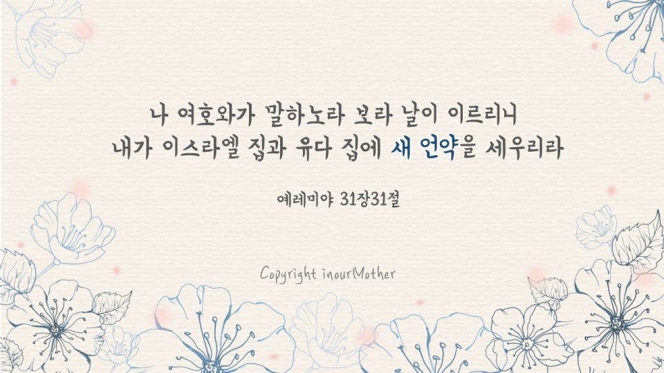 나 여호와가 말하노라 보라 날이 이르리니 내가 이스라엘 집과 유다 집에 새 언약을 세우리라...곧 내가 나의 법을 그들의 속에 두며 그 마음에 기록하여 나는 그들의 하나님이 되고 그들은 내 백성이 될 것이라 그들이 다시는 각기 이웃과 형제를 가리켜 이르기를 너는 여호와를 알라 하지 아니하리니 이는 작은 자로부터 큰 자까지 다 나를 앎이니라 (예레미야31장31~34절)